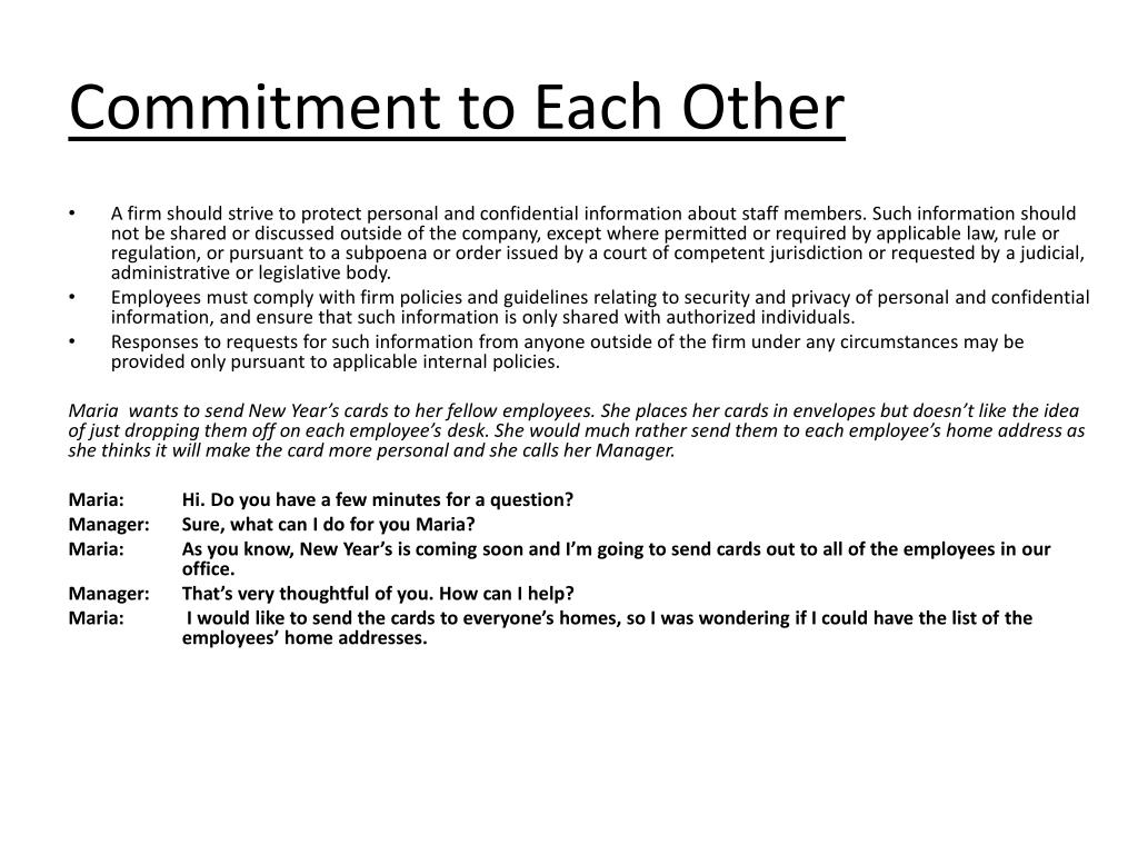 Commitment to Each Other • A firm should strive to protect personal and confidential information about staff members. Such information should not be shared or discussed outside of the company, except where permitted or required by applicable law, rule or regulation, or pursuant to a subpoena or order issued by a court of competent jurisdiction or requested by a judicial, administrative or legislative body. • Employees must comply with firm policies and guidelines relating to security and privacy of personal and confidential information, and ensure that such information is only shared with authorized individuals. • Responses to requests for such information from anyone outside of the firm under any circumstances may be provided only pursuant to applicable internal policies. Maria wants to send New Year’s cards to her fellow employees. She places her cards in envelopes but doesn’t like the idea of just dropping them off on each employee’s desk. She would much rather send them to each employee’s home address as she thinks it will make the card more personal and she calls her Manager. Maria: Hi. Do you have a few minutes for a question? Manager: Sure, what can I do for you Maria? Maria: As you know, New Year’s is coming soon and I’m going to send cards out to all of the employees in our office. Manager: That’s very thoughtful of you. How can I help? Maria: I would like to send the cards to everyone’s homes, so I was wondering if I could have the list of the employees’ home addresses.