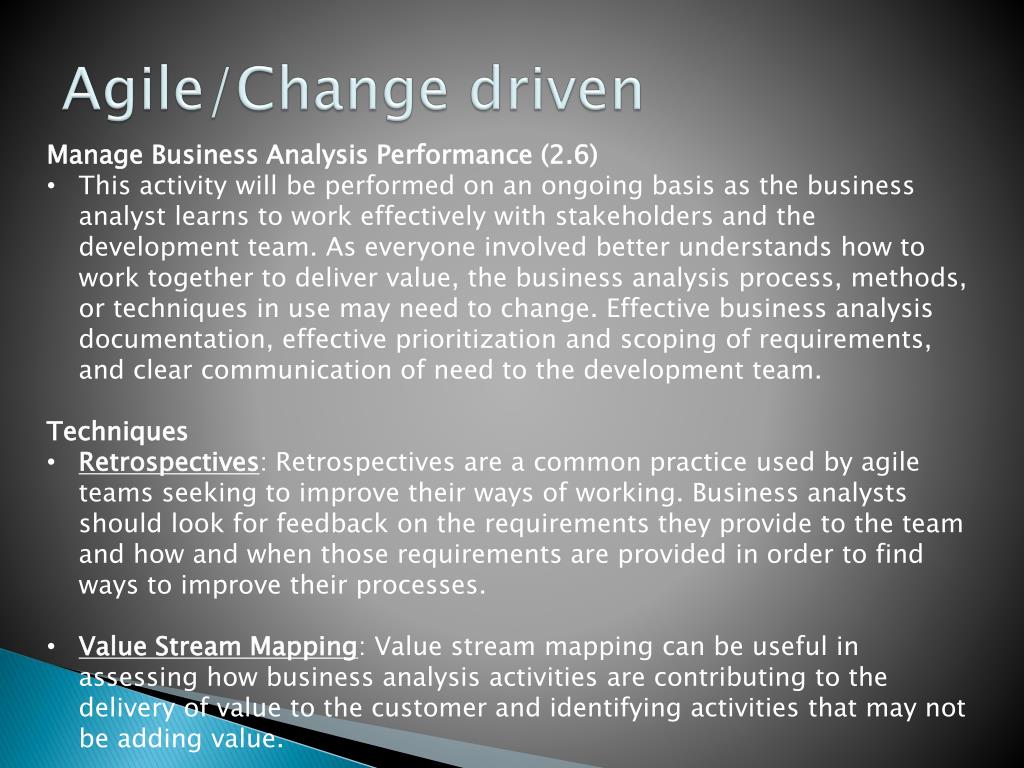 Agile/Change driven • Manage Business Analysis Performance (2.6) • This activity will be performed on an ongoing basis as the business analyst learns to work effectively with stakeholders and the development team. As everyone involved better understands how to work together to deliver value, the business analysis process, methods, or techniques in use may need to change. Effective business analysis documentation, effective prioritization and scoping of requirements, and clear communication of need to the development team. • Techniques • Retrospectives: Retrospectives are a common practice used by agile teams seeking to improve their ways of working. Business analysts should look for feedback on the requirements they provide to the team and how and when those requirements are provided in order to find ways to improve their processes. • Value Stream Mapping: Value stream mapping can be useful in assessing how business analysis activities are contributing to the delivery of value to the customer and identifying activities that may not be adding value.