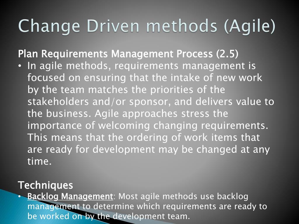Change Driven methods (Agile) • Plan Requirements Management Process (2.5) • In agile methods, requirements management is focused on ensuring that the intake of new work by the team matches the priorities of the stakeholders and/or sponsor, and delivers value to the business. Agile approaches stress the importance of welcoming changing requirements. This means that the ordering of work items that are ready for development may be changed at any time. • Techniques • Backlog Management: Most agile methods use backlog management to determine which requirements are ready to be worked on by the development team.