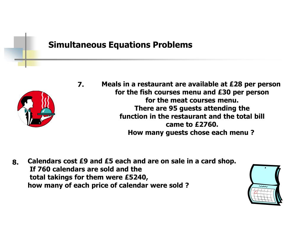 Simultaneous Equations Problems Meals in a restaurant are available at £28 per person for the fish courses menu and £30 per person for the meat courses menu. There are 95 guests attending the function in the restaurant and the total bill came to £2760. How many guests chose each menu ? 7. Calendars cost £9 and £5 each and are on sale in a card shop. If 760 calendars are sold and the total takings for them were £5240, how many of each price of calendar were sold ? 8.