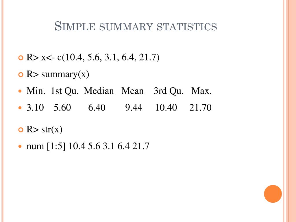 Simple summary statistics • R> x<- c(10.4, 5.6, 3.1, 6.4, 21.7) • R> summary(x) • Min. 1st Qu. Median Mean 3rd Qu. Max. • 3.10 5.60 6.40 9.44 10.40 21.70 • R> str(x) • num [1:5] 10.4 5.6 3.1 6.4 21.7