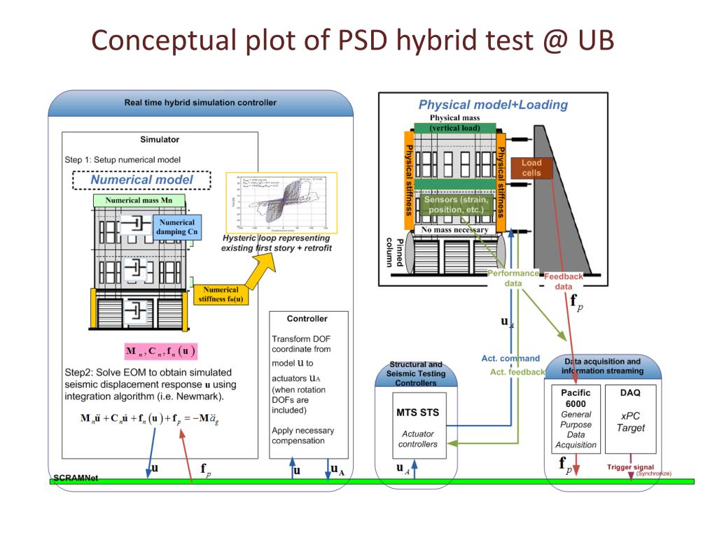 Slow PSD hybrid test @UB NEES Objective : to develop an increased understanding of the effects of first floor (soft-story) retrofits on the upper stories • Specimen: 3-dimensional (near) full scale model with and without retrofit • Numerical substructure: existing first story with various retrofits • Physical substructure: upper stories, full representation with construction details • Use six actuators to consider rotation