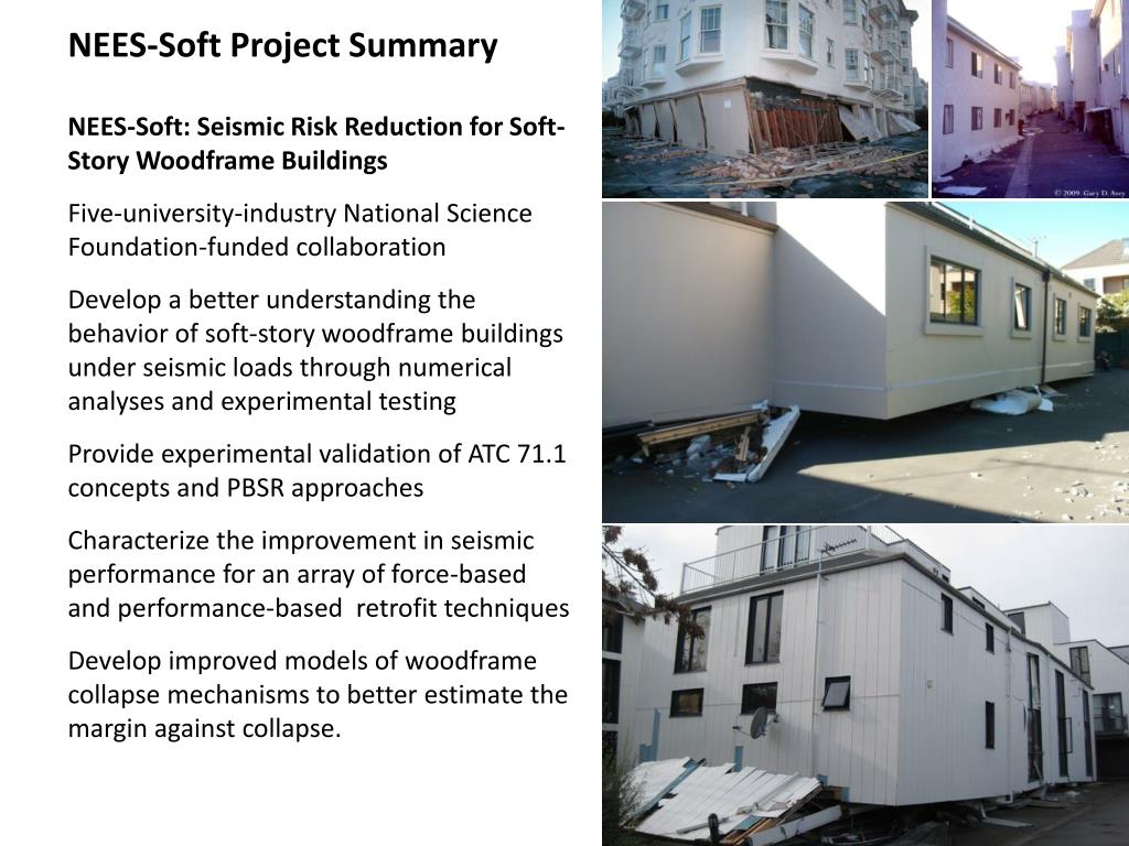 NEES-Soft Project Summary NEES-Soft: Seismic Risk Reduction for Soft-Story Woodframe Buildings Five-university-industry National Science Foundation-funded collaboration Develop a better understanding the behavior of soft-story woodframe buildings under seismic loads through numerical analyses and experimental testing Provide experimental validation of ATC 71.1 concepts and PBSR approaches Characterize the improvement in seismic performance for an array of force-based and performance-based retrofit techniques Develop improved models of woodframe collapse mechanisms to better estimate the margin against collapse.