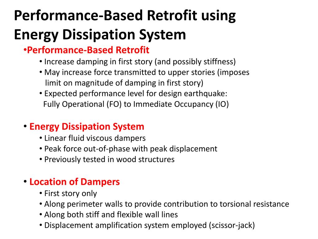 Performance-Based Retrofit using Energy Dissipation System • Performance-Based Retrofit • Increase damping in first story (and possibly stiffness) • May increase force transmitted to upper stories (imposes • limit on magnitude of damping in first story) • Expected performance level for design earthquake: • Fully Operational (FO) to Immediate Occupancy (IO) • Energy Dissipation System • Linear fluid viscous dampers • Peak force out-of-phase with peak displacement • Previously tested in wood structures • Location of Dampers • First story only • Along perimeter walls to provide contribution to torsionalresistance • Along both stiff and flexible wall lines • Displacement amplification system employed (scissor-jack)