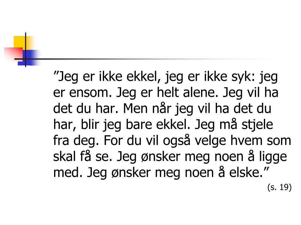 ”Jeg er ikke ekkel, jeg er ikke syk: jeg er ensom. Jeg er helt alene. Jeg vil ha det du har. Men når jeg vil ha det du har, blir jeg bare ekkel. Jeg må stjele fra deg. For du vil også velge hvem som skal få se. Jeg ønsker meg noen å ligge med. Jeg ønsker meg noen å elske.” (s. 19)