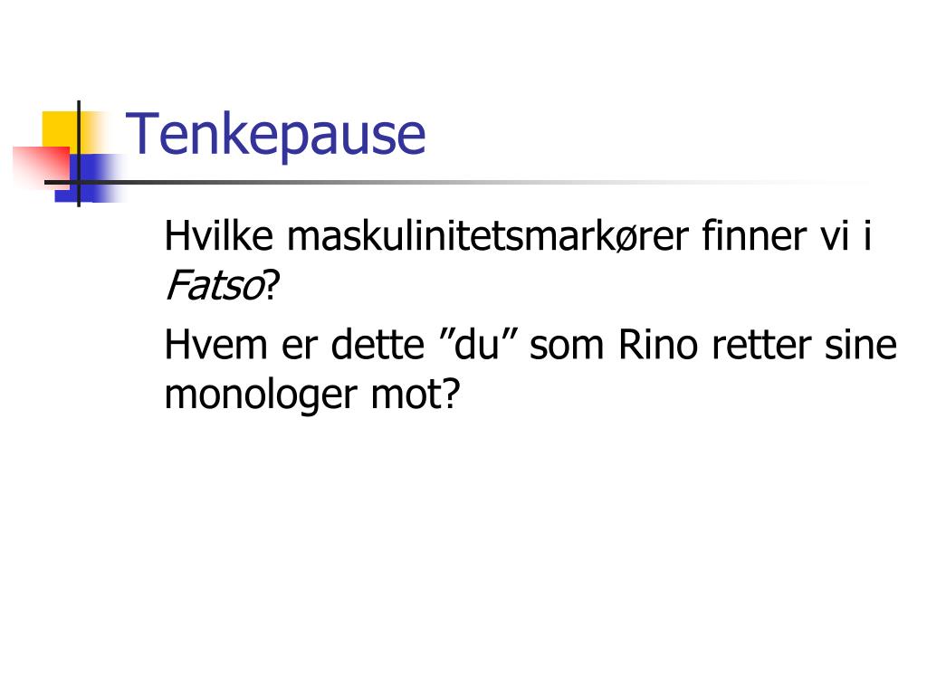 Tenkepause Hvilke maskulinitetsmarkører finner vi i Fatso? Hvem er dette ”du” som Rino retter sine monologer mot?