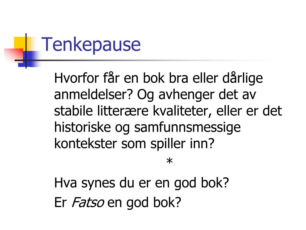 Tenkepause Hvorfor får en bok bra eller dårlige anmeldelser? Og avhenger det av stabile litterære kvaliteter, eller er det historiske og samfunnsmessige kontekster som spiller inn? * Hva synes du er en god bok? Er Fatso en god bok?