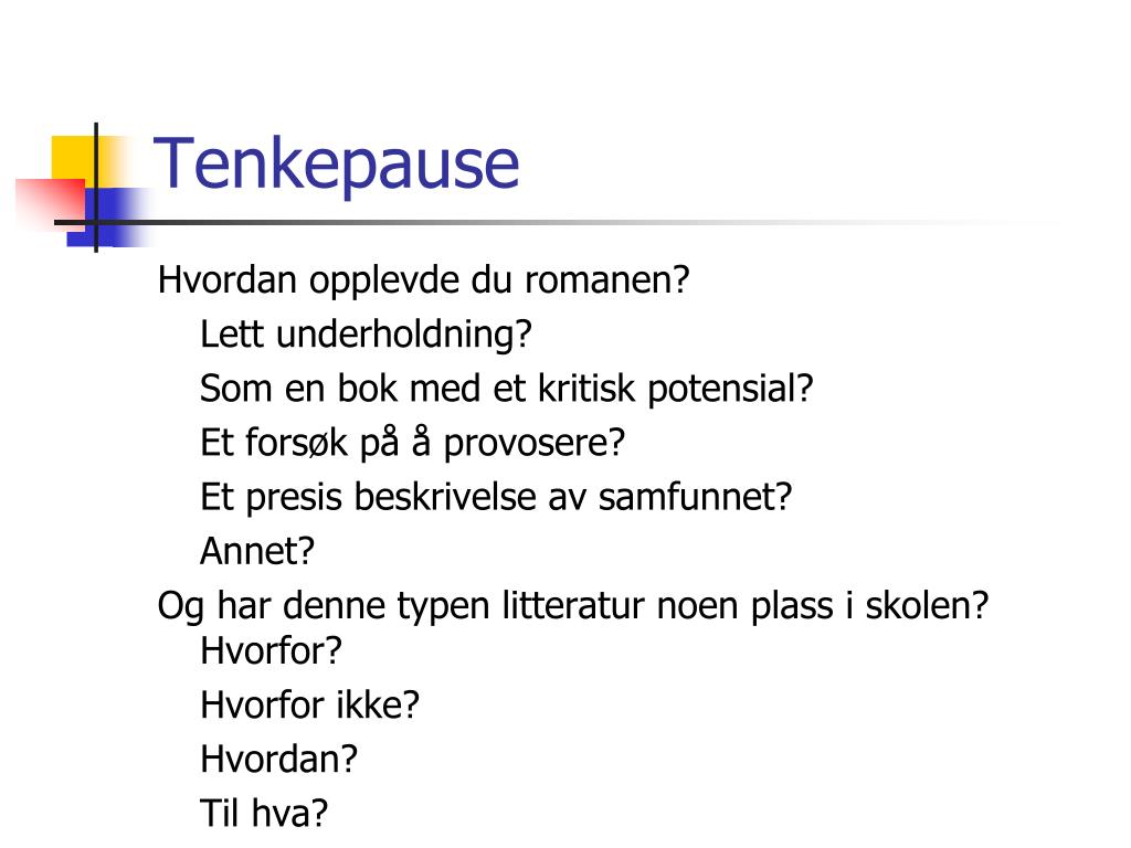 Tenkepause Hvordan opplevde du romanen? Lett underholdning? Som en bok med et kritisk potensial? Et forsøk på å provosere? Et presis beskrivelse av samfunnet? Annet? Og har denne typen litteratur noen plass i skolen? Hvorfor? Hvorfor ikke? Hvordan? Til hva?