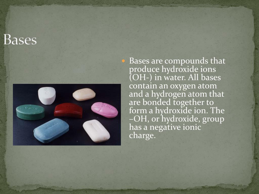 Bases • Bases are compounds that produce hydroxide ions (OH-) in water. All bases contain an oxygen atom and a hydrogen atom that are bonded together to form a hydroxide ion. The –OH, or hydroxide, group has a negative ionic charge.