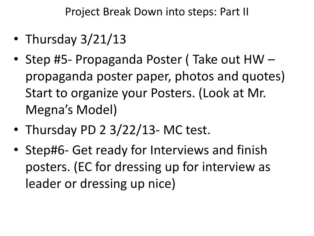 Project Break Down into steps: Part II • Thursday 3/21/13 • Step #5- Propaganda Poster ( Take out HW – propaganda poster paper, photos and quotes) Start to organize your Posters. (Look at Mr. Megna’s Model) • Thursday PD 2 3/22/13- MC test. • Step#6- Get ready for Interviews and finish posters. (EC for dressing up for interview as leader or dressing up nice)