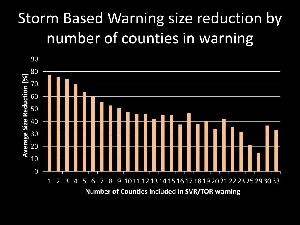 Lets get quantitative • Perimeter Influence • How much of the polygon perimeter coincides with a political boundary • Size Reduction • How much smaller was the warning than the counties it was issued against.