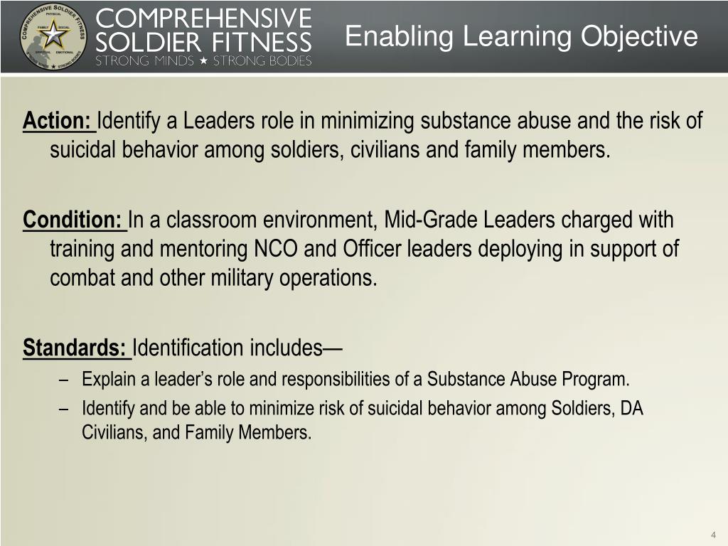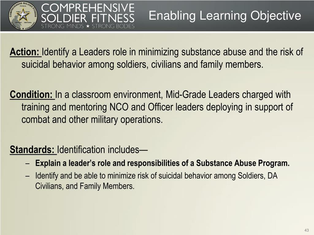 Enabling Learning Objective Action:Identify a Leaders role in minimizing substance abuse and the risk of suicidal behavior among soldiers, civilians and family members. Condition: In a classroom environment, Mid-Grade Leaders charged with training and mentoring NCO and Officer leaders deploying in support of combat and other military operations. Standards:Identification includes— Explain a leader’s role and responsibilities of a Substance Abuse Program. Identify and be able to minimize risk of suicidal behavior among Soldiers, DA Civilians, and Family Members.