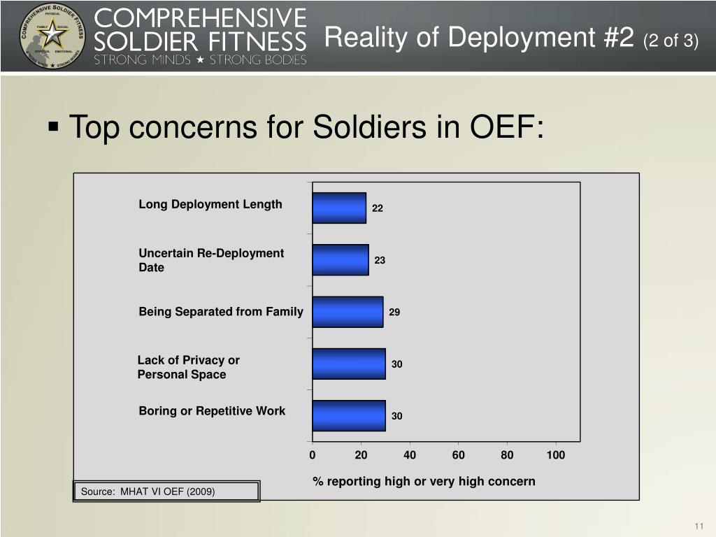 Reality of Deployment #2 (2 of 3) • Top concerns for Soldiers in OEF: Long Deployment Length Uncertain Re-Deployment Date Being Separated from Family Lack of Privacy or Personal Space Boring or Repetitive Work Source: MHAT VI OEF (2009)