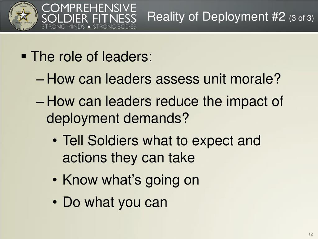 Reality of Deployment #2 (3 of 3) • The role of leaders: • How can leaders assess unit morale? • How can leaders reduce the impact of deployment demands? • Tell Soldiers what to expect and actions they can take • Know what’s going on • Do what you can