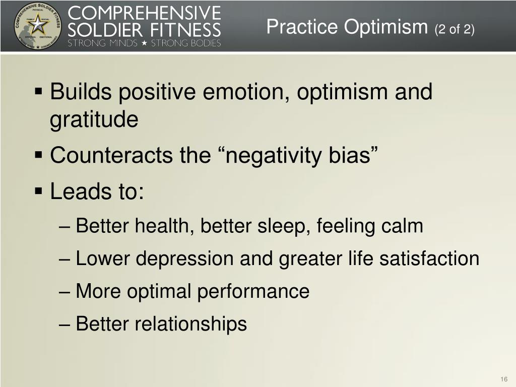 Practice Optimism (2 of 2) • Builds positive emotion, optimism and gratitude • Counteracts the “negativity bias” • Leads to: • Better health, better sleep, feeling calm • Lower depression and greater life satisfaction • More optimal performance • Better relationships