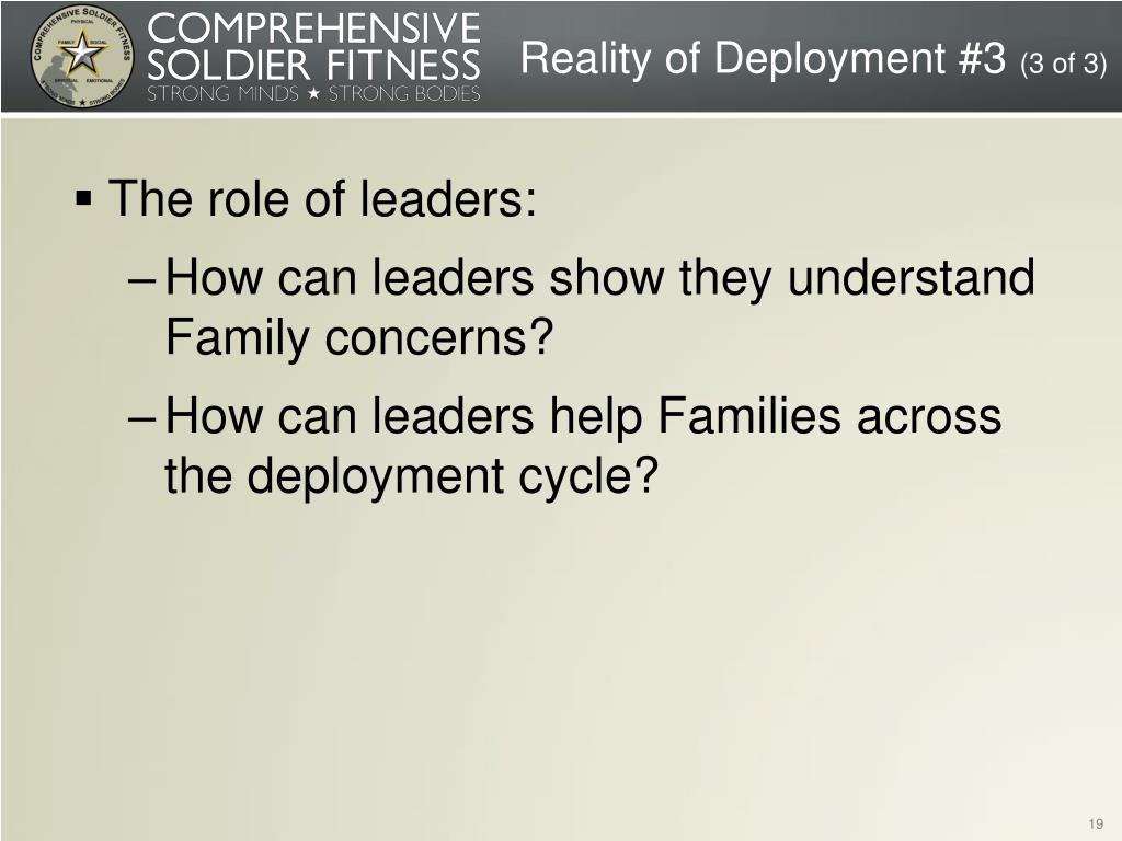 Reality of Deployment #3 (3 of 3) • The role of leaders: • How can leaders show they understand Family concerns? • How can leaders help Families across the deployment cycle?