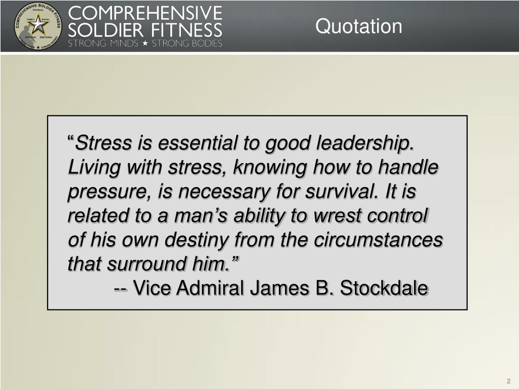 Quotation “Stress is essential to good leadership. Living with stress, knowing how to handle pressure, is necessary for survival. It is related to a man’s ability to wrest control of his own destiny from the circumstances that surround him.” -- Vice Admiral James B. Stockdale
