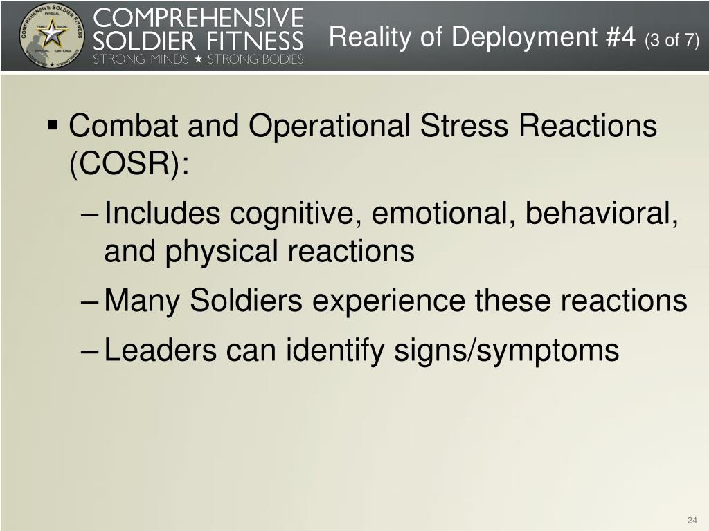 Reality of Deployment #4 (3 of 7) • Combat and Operational Stress Reactions (COSR): • Includes cognitive, emotional, behavioral, and physical reactions • Many Soldiers experience these reactions • Leaders can identify signs/symptoms