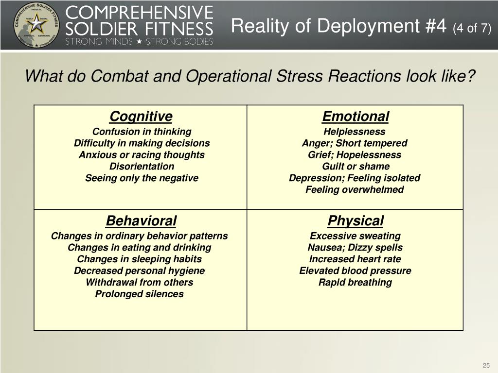Reality of Deployment #4 (4 of 7) What do Combat and Operational Stress Reactions look like? Confusion in thinking Difficulty in making decisions Anxious or racing thoughts Disorientation Seeing only the negative Helplessness Anger; Short tempered Grief; Hopelessness Guilt or shame Depression; Feeling isolated Feeling overwhelmed Changes in ordinary behavior patterns Changes in eating and drinking Changes in sleeping habits Decreased personal hygiene Withdrawal from others Prolonged silences Excessive sweating Nausea; Dizzy spells Increased heart rate Elevated blood pressure Rapid breathing