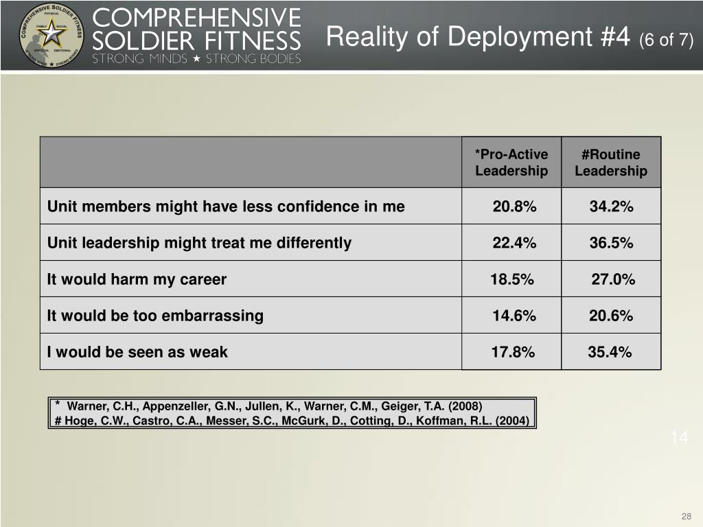 * Warner, C.H., Appenzeller, G.N., Jullen, K., Warner, C.M., Geiger, T.A. (2008) # Hoge, C.W., Castro, C.A., Messer, S.C., McGurk, D., Cotting, D., Koffman, R.L. (2004) Reality of Deployment #4 (6 of 7) *Pro-Active Leadership #Routine Leadership Unit members might have less confidence in me 20.8% 34.2% Unit leadership might treat me differently 22.4% 36.5% It would harm my career 18.5% 27.0% It would be too embarrassing 14.6% 20.6% I would be seen as weak 17.8% 35.4% 14