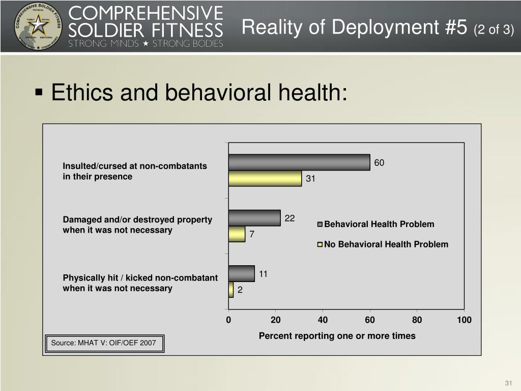 Reality of Deployment #5 (2 of 3) • Ethics and behavioral health: Insulted/cursed at non-combatants in their presence Damaged and/or destroyed property when it was not necessary Physically hit / kicked non-combatant when it was not necessary Source: MHAT V: OIF/OEF 2007