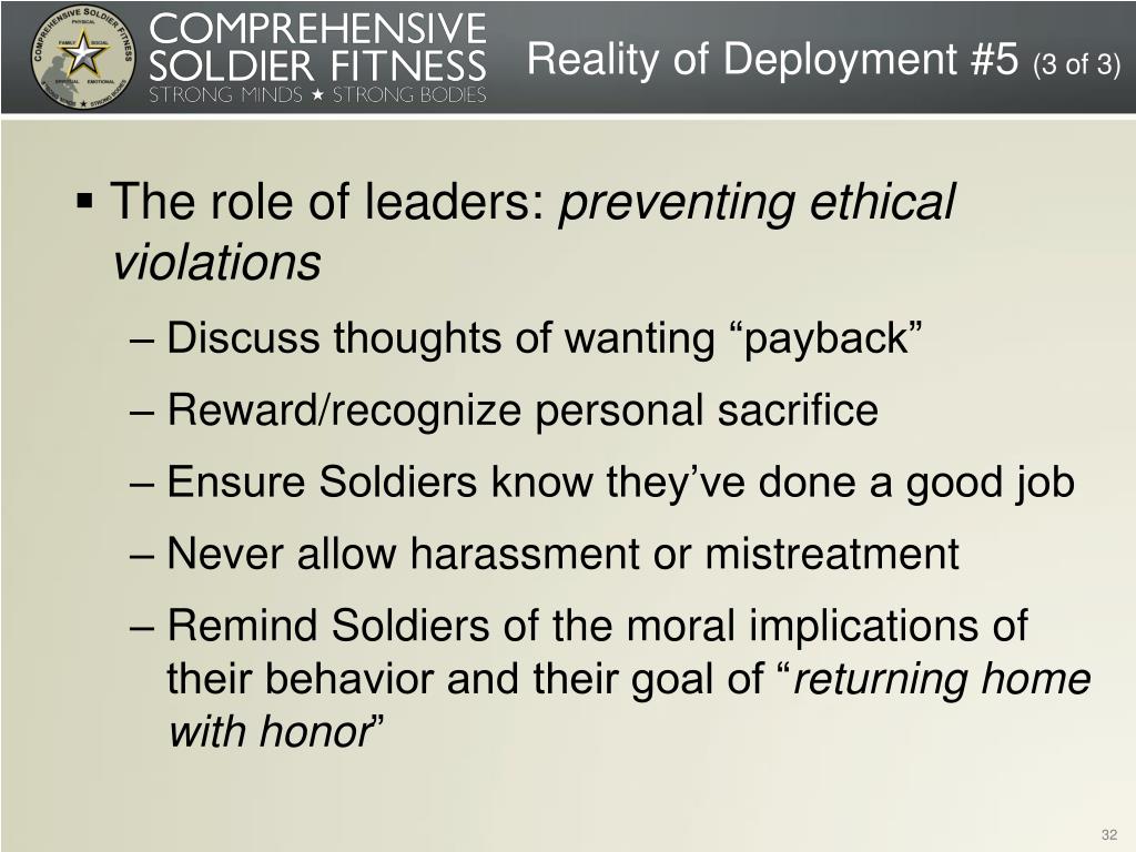 Reality of Deployment #5 (3 of 3) • The role of leaders: preventing ethical violations • Discuss thoughts of wanting “payback” • Reward/recognize personal sacrifice • Ensure Soldiers know they’ve done a good job • Never allow harassment or mistreatment • Remind Soldiers of the moral implications of their behavior and their goal of “returning home with honor”