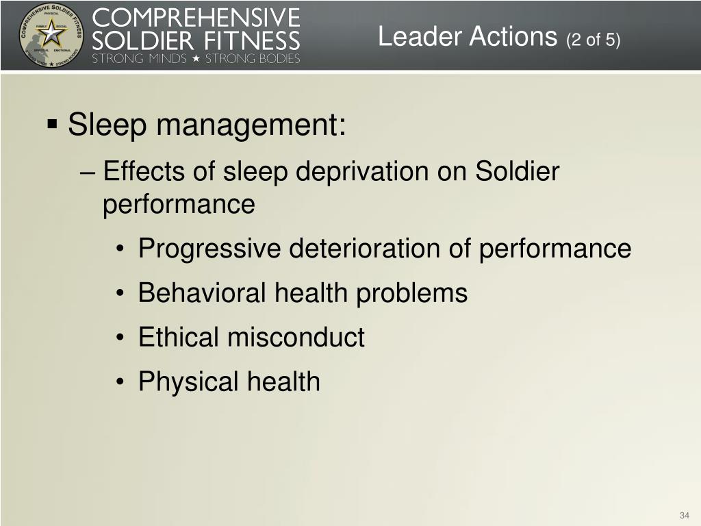 Leader Actions (2 of 5) • Sleep management: • Effects of sleep deprivation on Soldier performance • Progressive deterioration of performance • Behavioral health problems • Ethical misconduct • Physical health