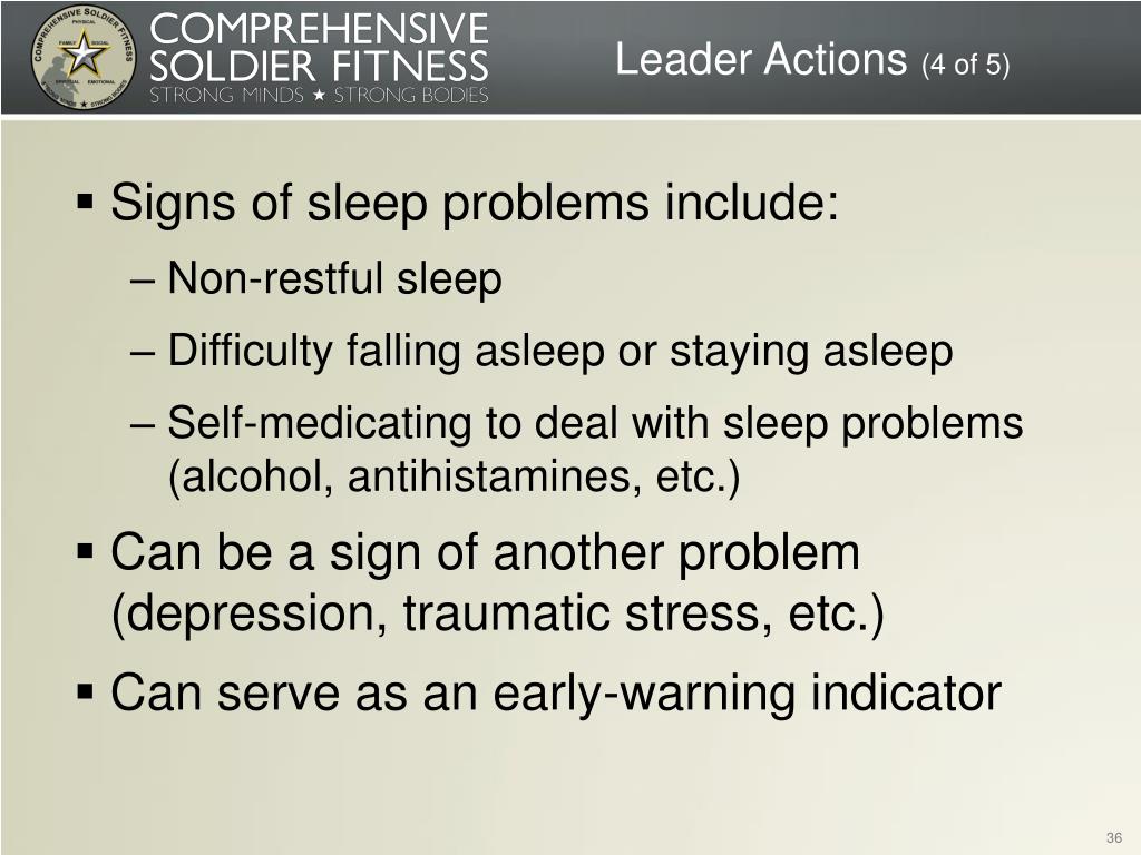 Leader Actions (4 of 5) • Signs of sleep problems include: • Non-restful sleep • Difficulty falling asleep or staying asleep • Self-medicating to deal with sleep problems (alcohol, antihistamines, etc.) • Can be a sign of another problem (depression, traumatic stress, etc.) • Can serve as an early-warning indicator