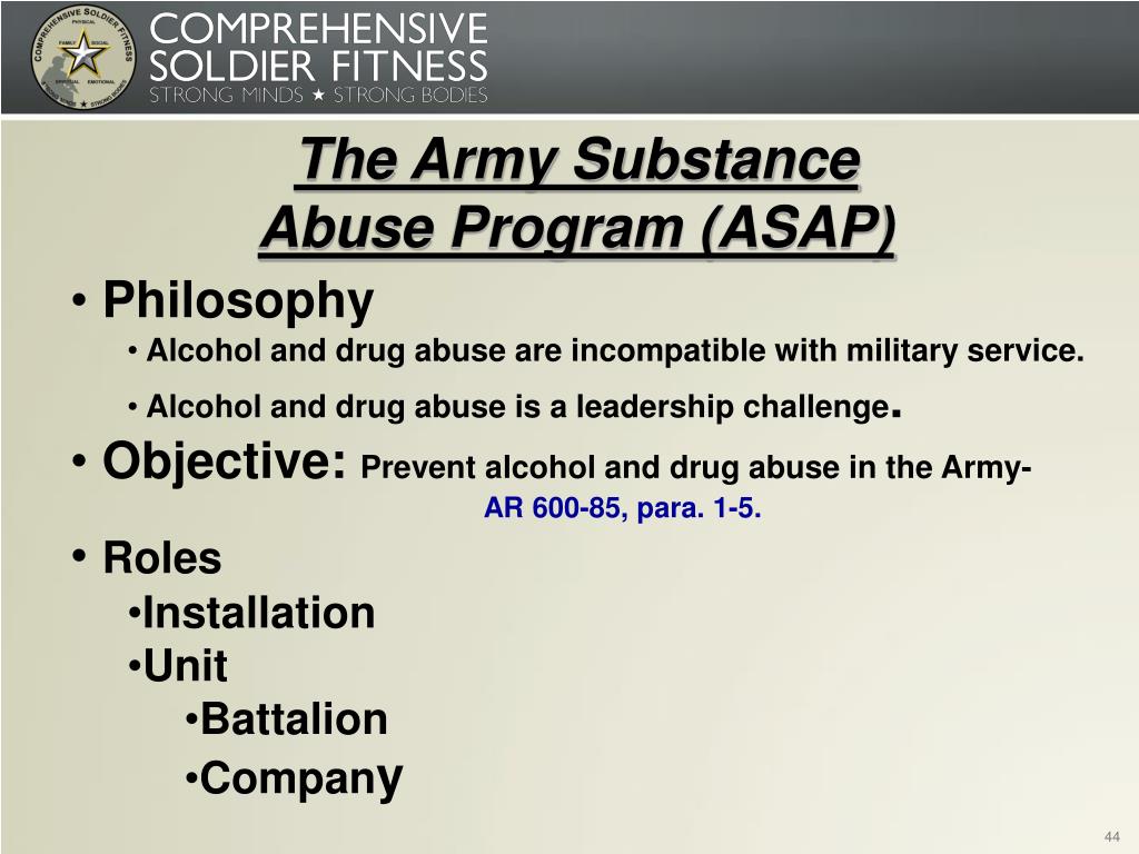 The Army Substance Abuse Program (ASAP) • Philosophy • Alcohol and drug abuse are incompatible with military service. • Alcohol and drug abuse is a leadership challenge. • Objective: Prevent alcohol and drug abuse in the Army- • AR 600-85, para. 1-5. • Roles • Installation • Unit • Battalion • Company