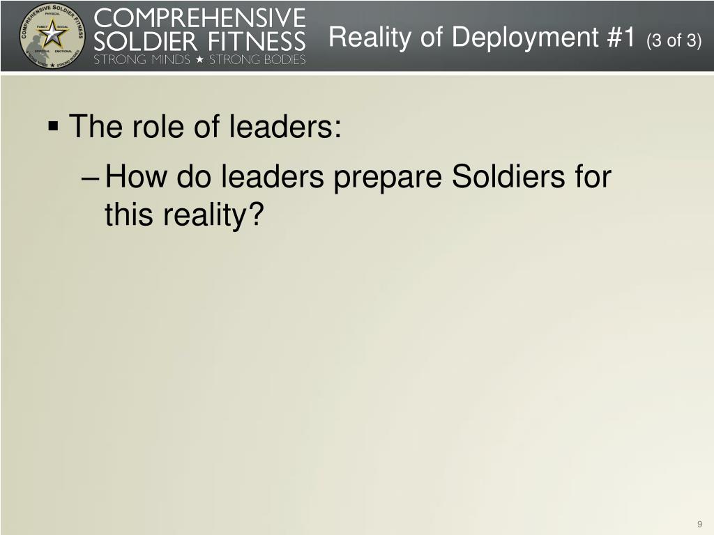 Reality of Deployment #1 (3 of 3) • The role of leaders: • How do leaders prepare Soldiers for this reality?