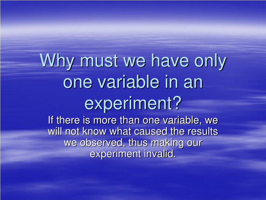Why must we have only one variable in an experiment? If there is more than one variable, we will not know what caused the results we observed, thus making our experiment invalid.