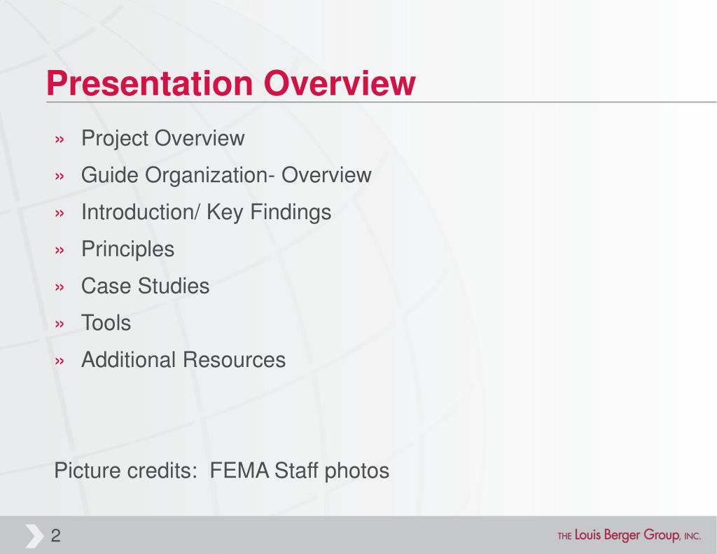 Presentation Overview • Project Overview • Guide Organization- Overview • Introduction/ Key Findings • Principles • Case Studies • Tools • Additional Resources Picture credits: FEMA Staff photos