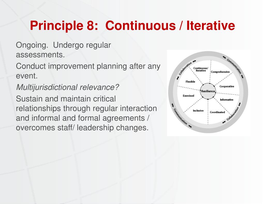 Principle 8: Continuous / Iterative Ongoing. Undergo regular assessments. Conduct improvement planning after any event. Multijurisdictional relevance? Sustain and maintain critical relationships through regular interaction and informal and formal agreements / overcomes staff/ leadership changes.