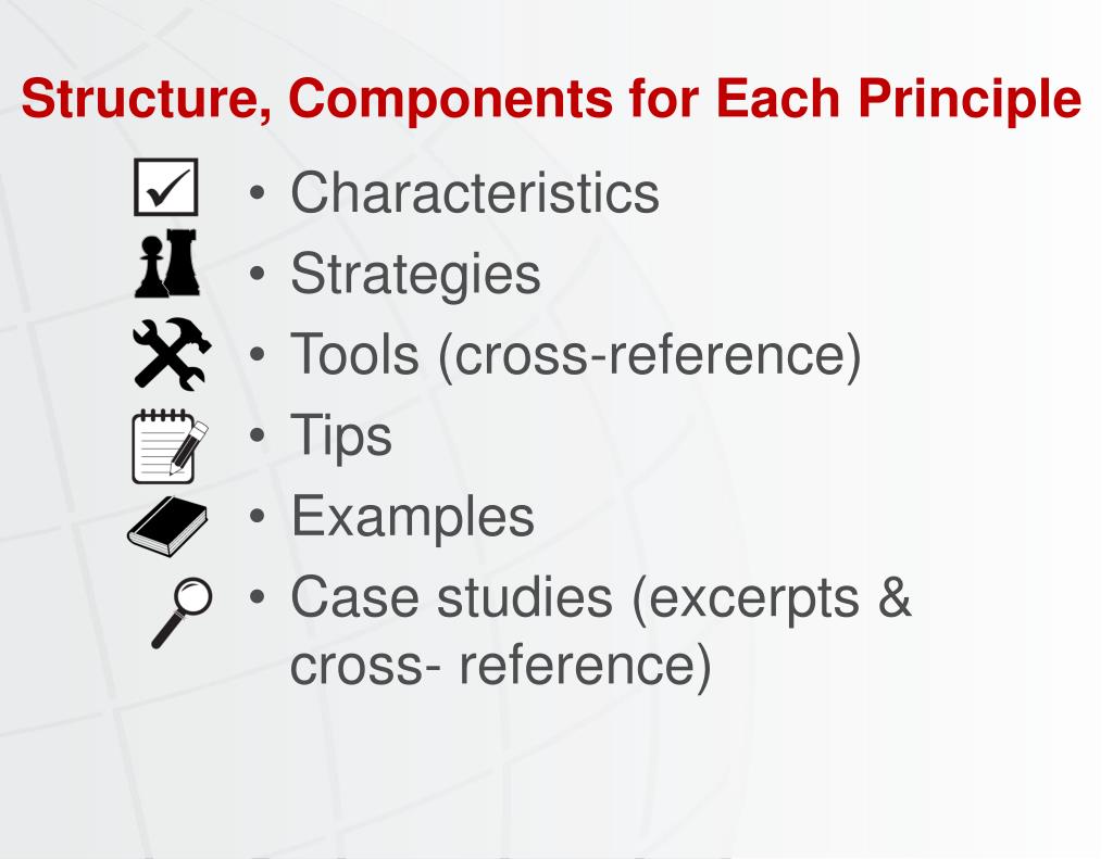 Structure, Components for Each Principle • Characteristics • Strategies • Tools (cross-reference) • Tips • Examples • Case studies (excerpts & cross- reference)