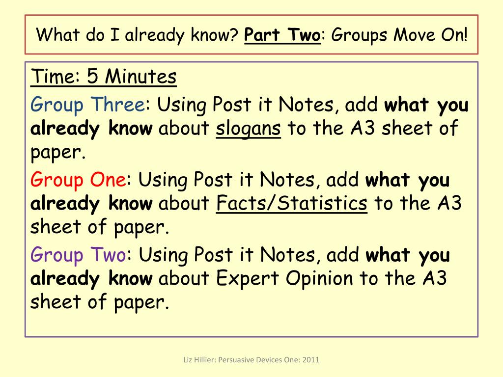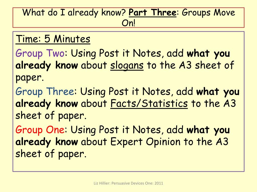 What do I already know? Part Three: Groups Move On! Time: 5 Minutes Group Two: Using Post it Notes, add what you already know about slogans to the A3 sheet of paper. Group Three: Using Post it Notes, add what you already know about Facts/Statisticsto the A3 sheet of paper. Group One: Using Post it Notes, add what you already know about Expert Opinion to the A3 sheet of paper. Liz Hillier: Persuasive Devices One: 2011