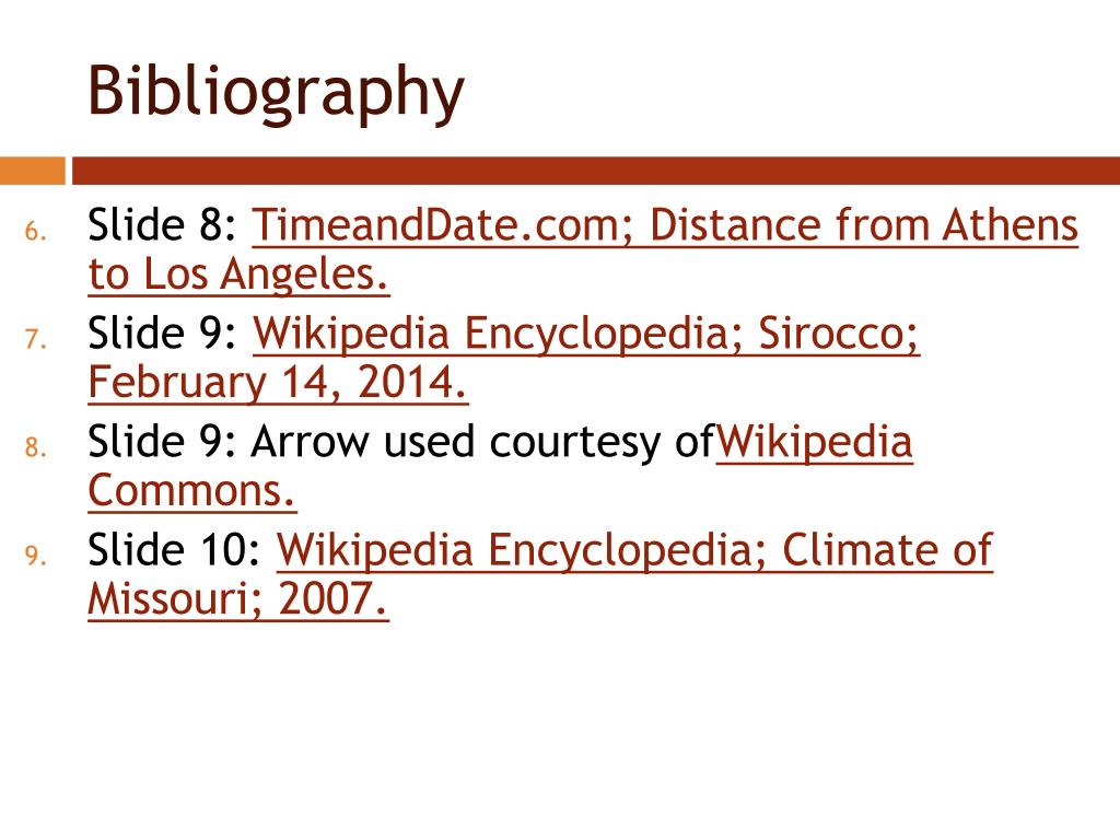 Bibliography • Slide 8: TimeandDate.com; Distance from Athens to Los Angeles. • Slide 9: Wikipedia Encyclopedia; Sirocco; February 14, 2014. • Slide 9: Arrow used courtesy ofWikipedia Commons. • Slide 10: Wikipedia Encyclopedia; Climate of Missouri; 2007.