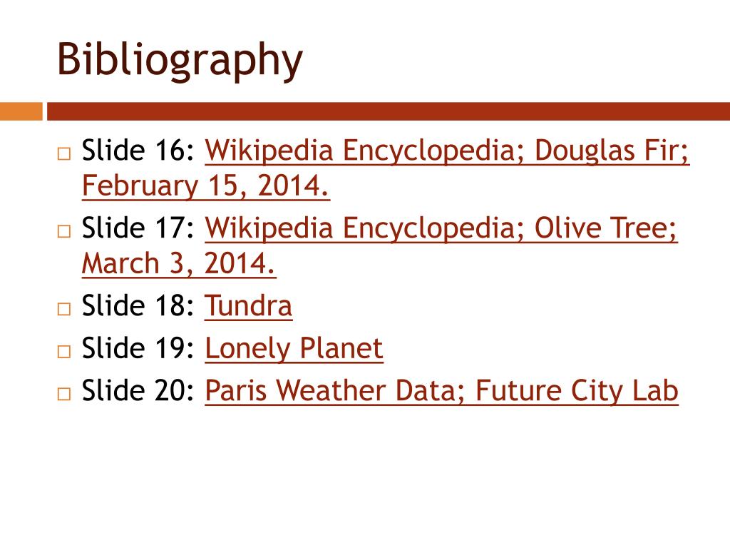 Bibliography • Slide 16: Wikipedia Encyclopedia; Douglas Fir; February 15, 2014. • Slide 17: Wikipedia Encyclopedia; Olive Tree; March 3, 2014. • Slide 18: Tundra • Slide 19: Lonely Planet • Slide 20: Paris Weather Data; Future City Lab