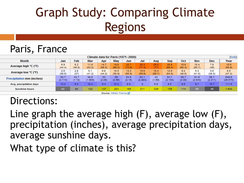 Graph Study: Comparing Climate Regions Paris, France Directions: Line graph the average high (F), average low (F), precipitation (inches), average precipitation days, average sunshine days. What type of climate is this?