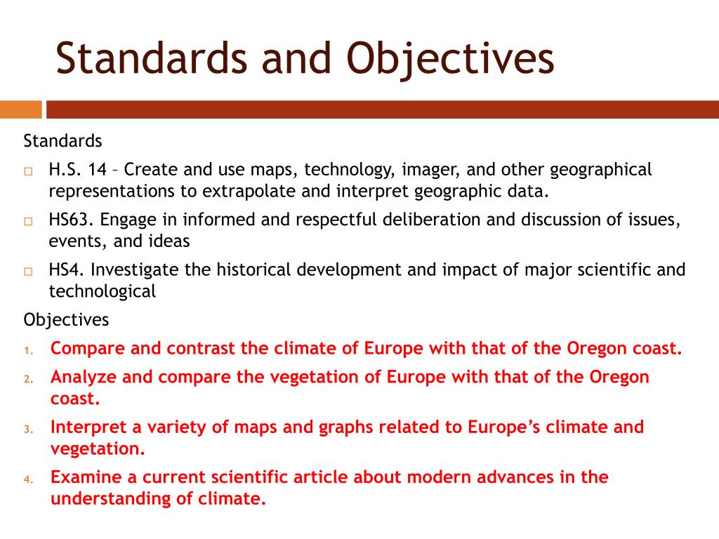 Standards and Objectives Standards • H.S. 14 – Create and use maps, technology, imager, and other geographical representations to extrapolate and interpret geographic data. • HS63. Engage in informed and respectful deliberation and discussion of issues, events, and ideas • HS4. Investigate the historical development and impact of major scientific and technological Objectives • Compare and contrast the climate of Europe with that of the Oregon coast. • Analyze and compare the vegetation of Europe with that of the Oregon coast. • Interpret a variety of maps and graphs related to Europe’s climate and vegetation. • Examine a current scientific article about modern advances in the understanding of climate.