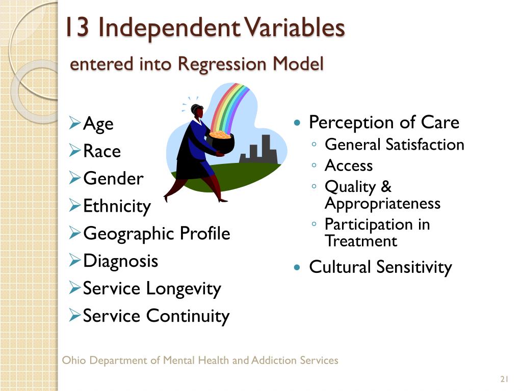 13 Independent Variablesentered into Regression Model • Age • Race • Gender • Ethnicity • Geographic Profile • Diagnosis • Service Longevity • Service Continuity • Perception of Care • General Satisfaction • Access • Quality & Appropriateness • Participation in Treatment • Cultural Sensitivity Ohio Department of Mental Health and Addiction Services