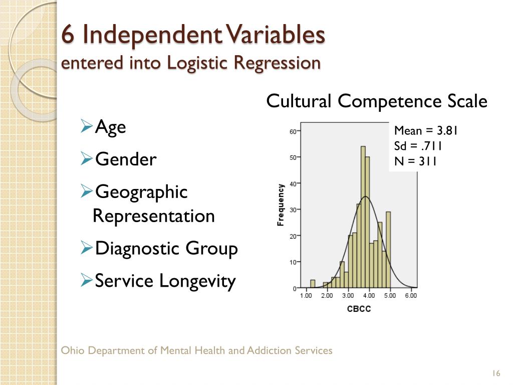 6 Independent Variablesentered into Logistic Regression • Age • Gender • Geographic Representation • Diagnostic Group • Service Longevity CulturalCompetence Scale Mean = 3.81 Sd = .711 N = 311 Ohio Department of Mental Health and Addiction Services