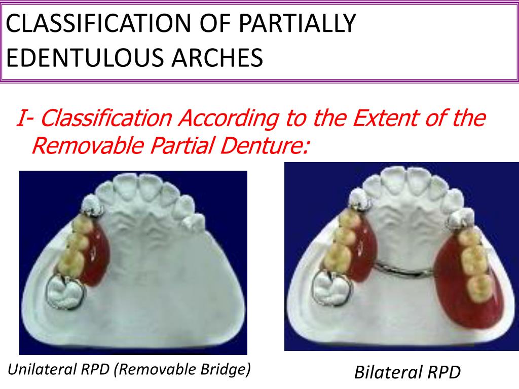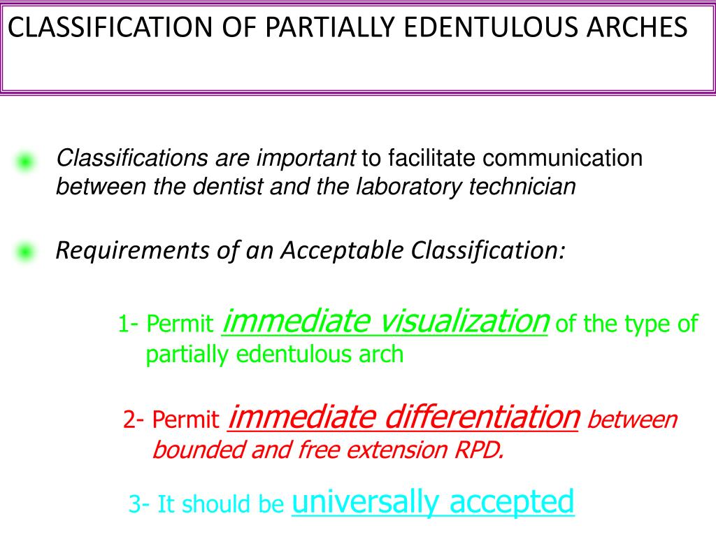Introduction to R.P.D. Dr.noracheta. CLASSIFICATION OF PARTIALLY EDENTULOUS ARCHES. Classifications are important to facilitate communication between the dentist and the laboratory technician. Requirements of an Acceptable Classification:.
