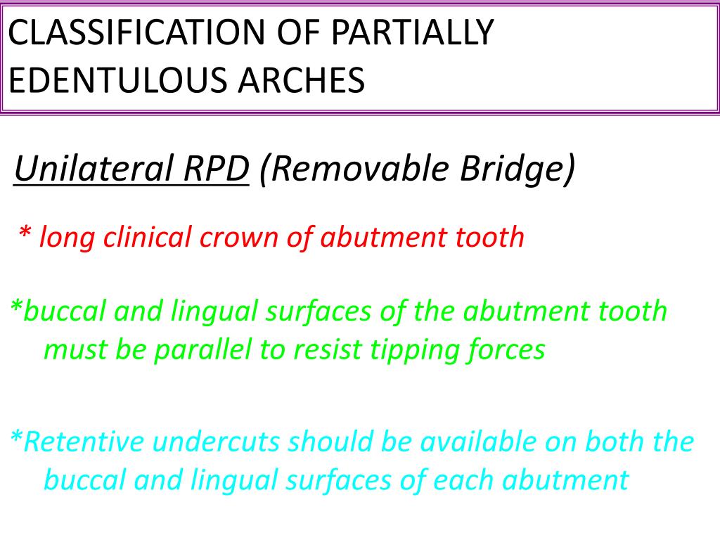 CLASSIFICATION OF PARTIALLY EDENTULOUS ARCHES Unilateral RPD (RemovableBridge) * longclinical crown of abutment tooth *buccal and lingual surfaces of the abutment tooth must be parallel to resist tipping forces *Retentive undercuts should be available on both the buccal and lingual surfaces of each abutment