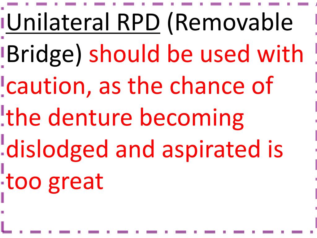 Unilateral RPD (Removable Bridge)should be used with caution, as the chance of the denture becoming dislodged and aspirated is too great