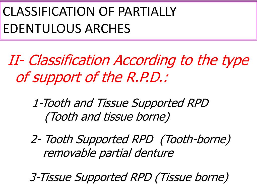CLASSIFICATION OF PARTIALLY EDENTULOUS ARCHES II- Classification According to the type of support of the R.P.D.: 1-Tooth and Tissue Supported RPD (Tooth and tissue borne) 2- Tooth Supported RPD (Tooth-borne) removable partial denture 3-Tissue Supported RPD (Tissue borne)