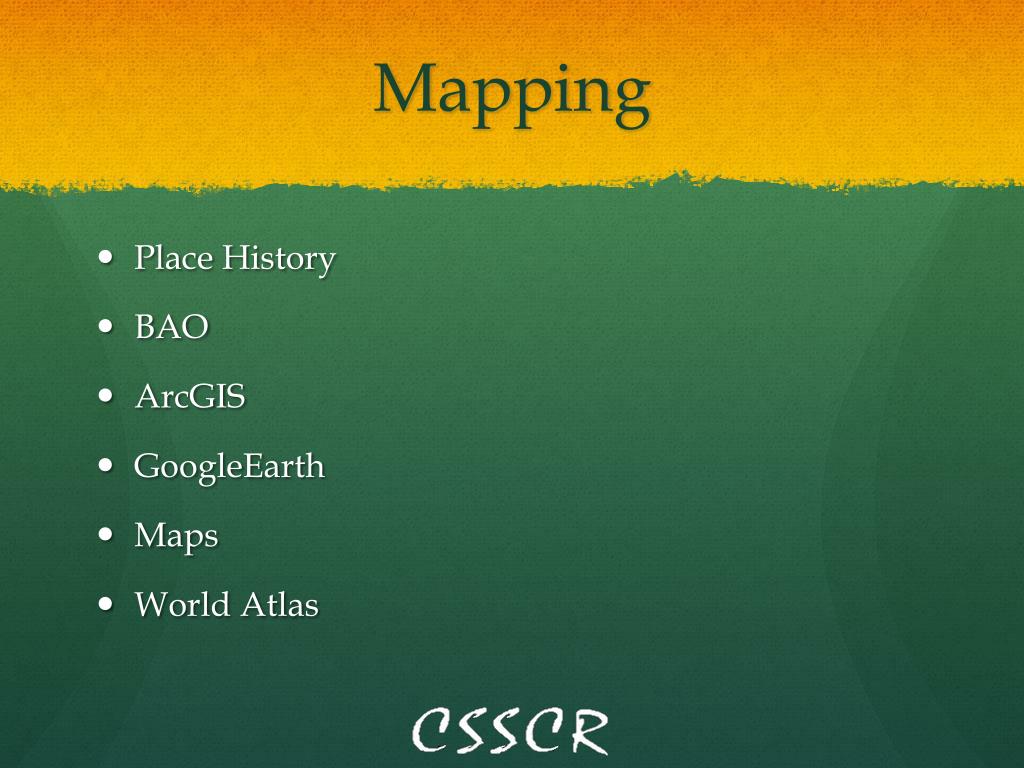 Mapping • Place History • BAO • ArcGIS • GoogleEarth • Maps • World Atlas