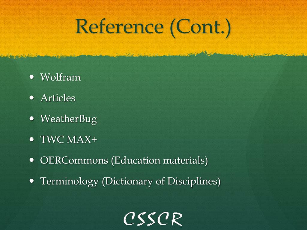 Reference (Cont.) • Wolfram • Articles • WeatherBug • TWC MAX+ • OERCommons (Education materials) • Terminology (Dictionary of Disciplines)