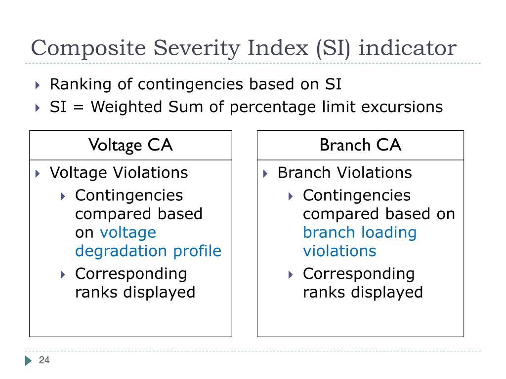 Composite Severity Index (SI) indicator • Ranking of contingencies based on SI • SI = Weighted Sum of percentage limit excursions Voltage CA Branch CA • Voltage Violations • Contingencies compared based on voltage degradation profile • Corresponding ranks displayed • Branch Violations • Contingencies compared based on branch loading violations • Corresponding ranks displayed