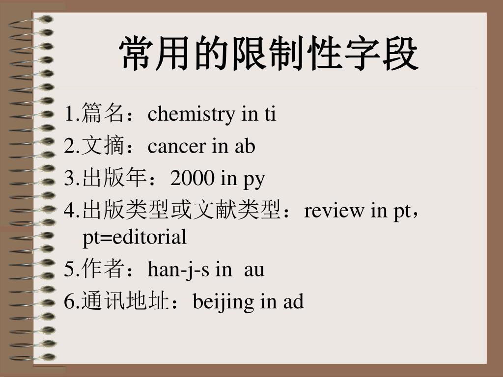 常用的限制性字段 1.篇名:chemistry in ti 2.文摘:cancer in ab 3.出版年:2000 in py 4.出版类型或文献类型:review in pt,pt=editorial 5.作者:han-j-s in au 6.通讯地址:beijing in ad
