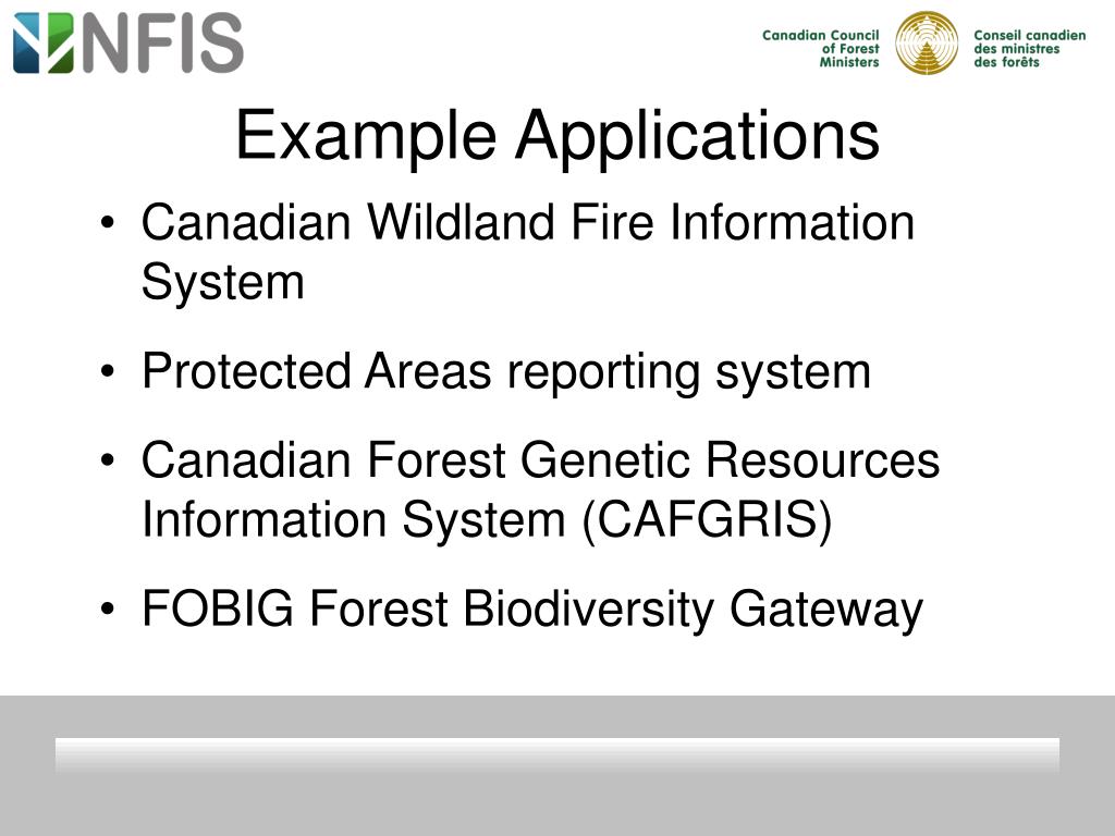 Example Applications • Canadian Wildland Fire Information System • Protected Areas reporting system • Canadian Forest Genetic Resources Information System (CAFGRIS) • FOBIG Forest Biodiversity Gateway